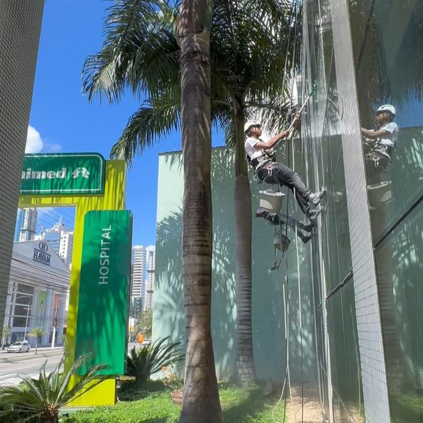 Limpeza e polimento das fachadas do Hospital Unimed.